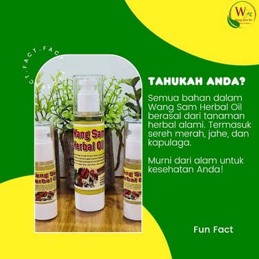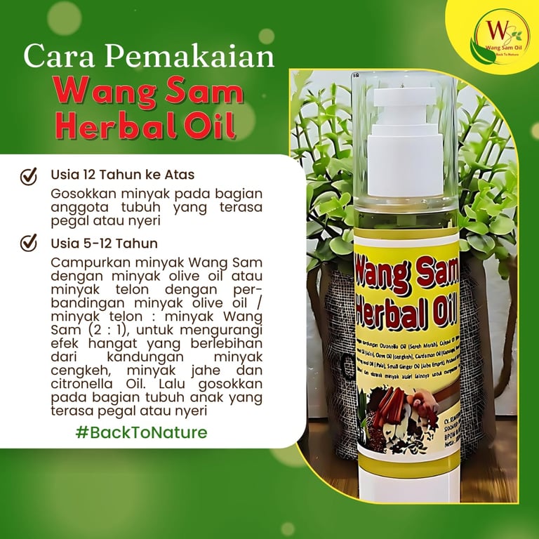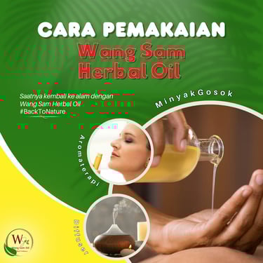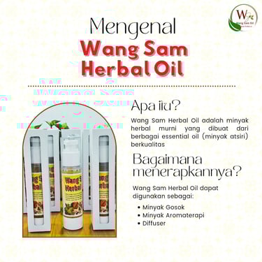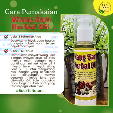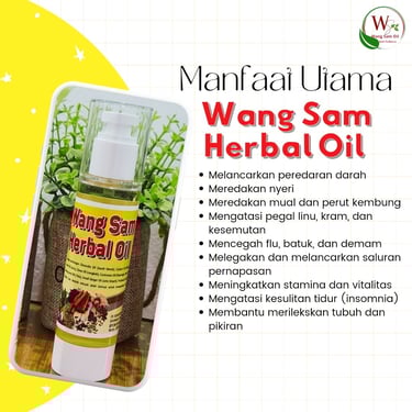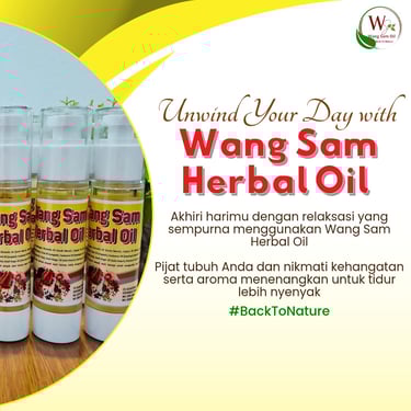 Dengan Minyak Herbal Wang Sam, Anda dapat memanfaatkan kekuatan alam untuk menjaga kesehatan dan kesejahteraan tubuh secara alami. Pilih Minyak Herbal Wang Sam untuk hidup sehat dan alami. Kembali ke alam, kembali ke kesehatan sejati dengan Wang Sam Herbal Oil.